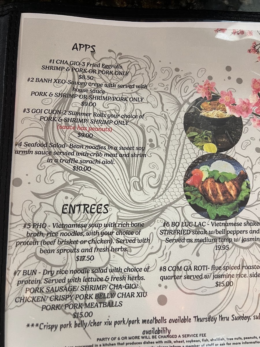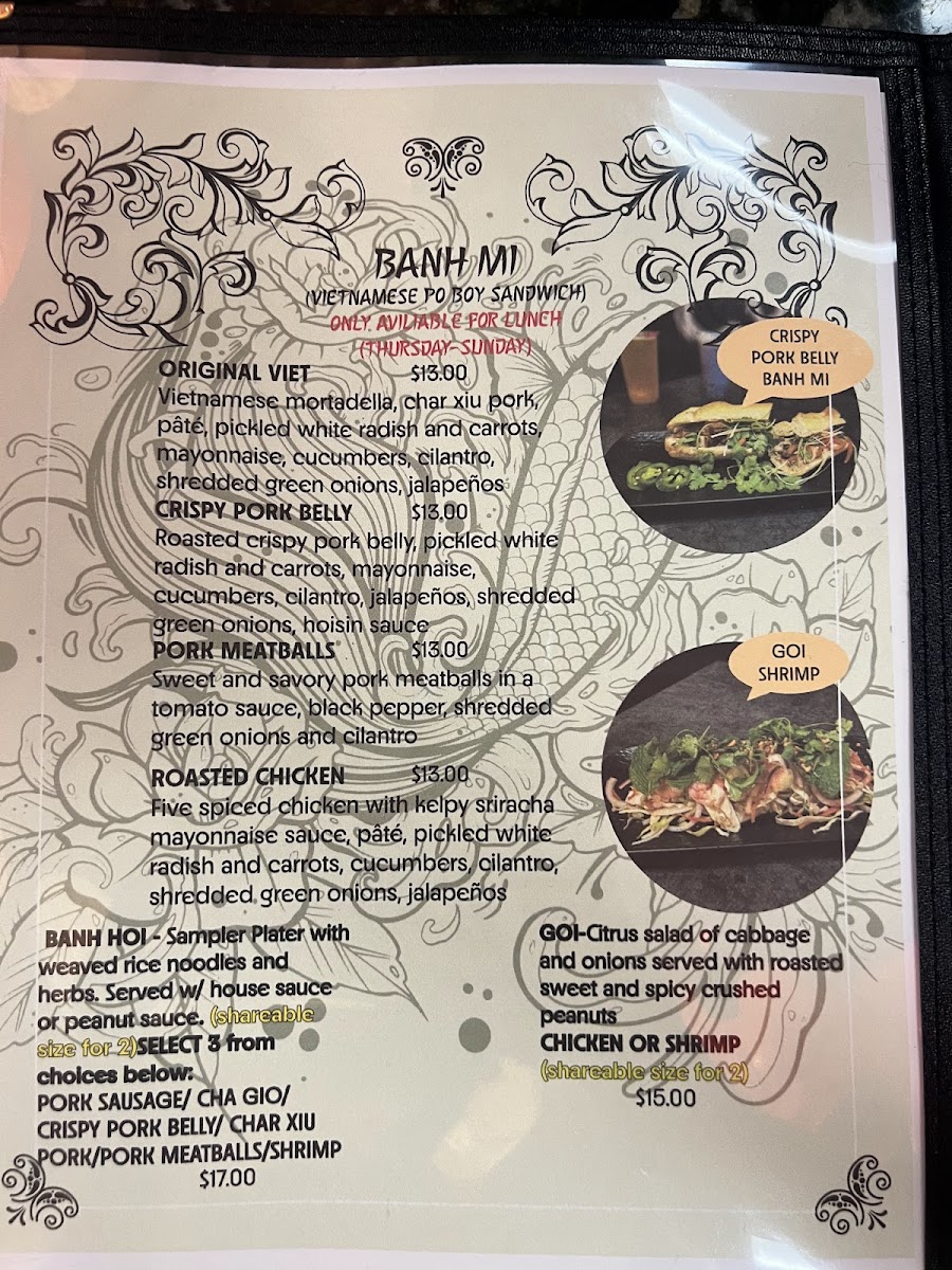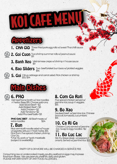 As a reviewer, the menu at Koi Cafe offers a comforting selection of Vietnamese and fusion dishes that balance fresh flavors with satisfying portions. The Pho w Beef stands out as a signature item, featuring a rich, aromatic broth paired with tender slices of beef and well-cooked noodles, making it a reliable choice for anyone seeking a traditional and hearty meal. The Spring Roll is a lighter option, fresh and neatly prepared, with a pleasant balance of crisp vegetables and protein, perfect as an appetizer. Another notable dish is the 7 Com G Roti, which brings a flavorful twist with its savory chicken and roti combination, offering something slightly different from the more traditional noodle soups. Overall, the menu provides a well-rounded mix of classic Vietnamese comfort food and unique house specialties, making it easy for diners to find something satisfying whether they want a light bite or a filling main course.